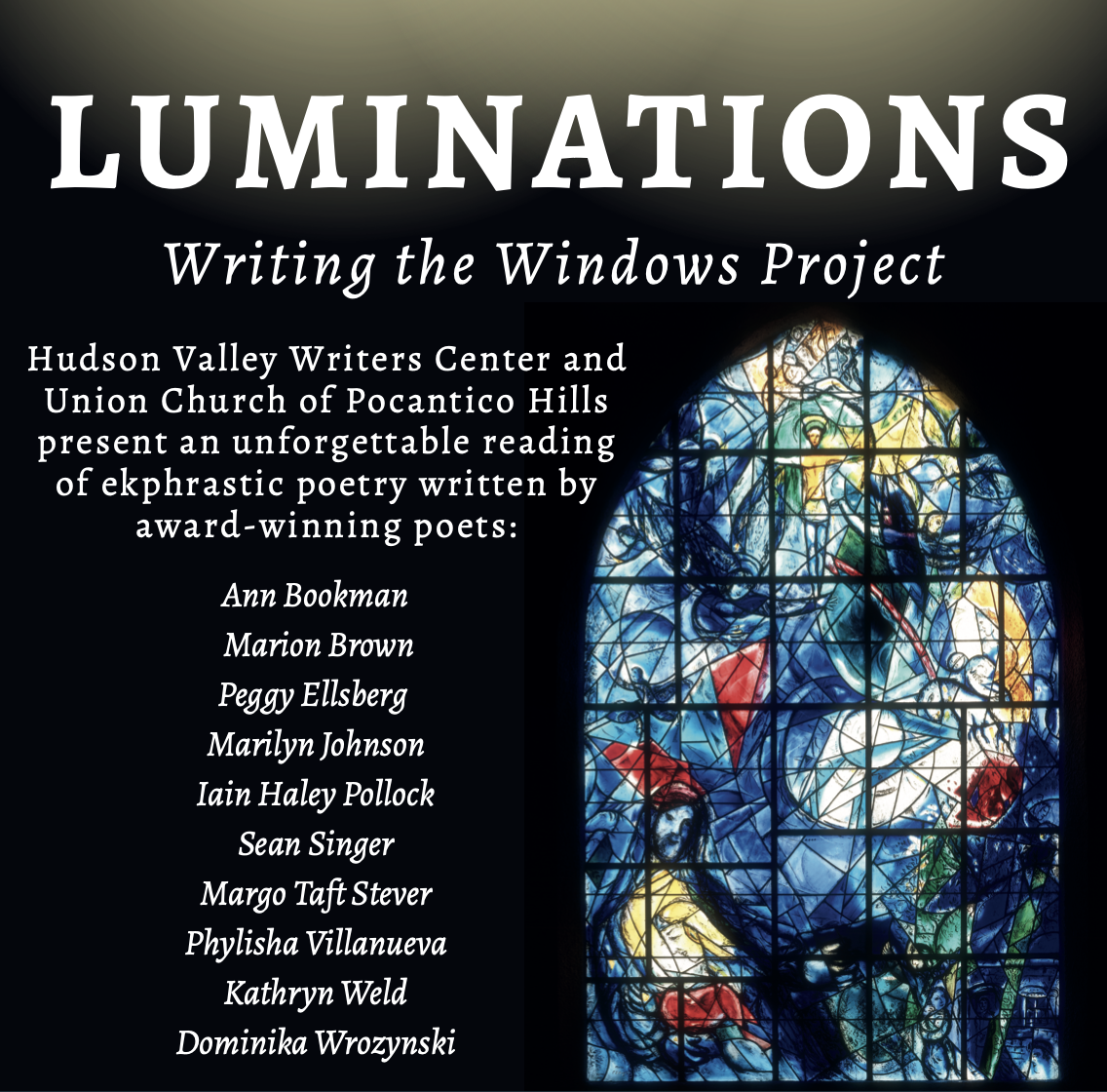 Luminations, Writing the Windows Project, hosted by Hudson Valley Writers Center and Union Church of Pocantico Hills. A reading of ekphrastic poetry featuring Ann Bookman, Marion Brown, Peggy Ellsberg, Marilyn Johnson, Iain Haley Pollock, Sean Singer, Margo Taft Stever, Phylisha Villanueva, Kathryn Weld, and Domika Wrozynski.